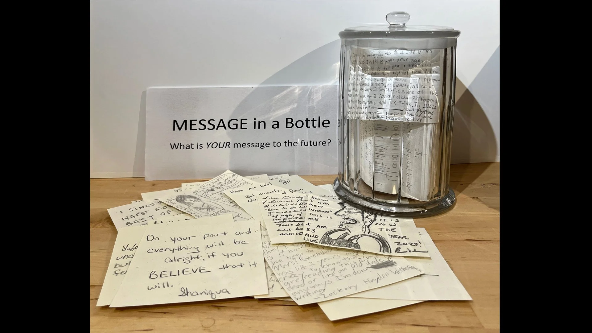 These projects were created by community organizations and individual artists to communicate to the future about our hopes and dreams and to give a glimpse into our lives here in 2023. Everything was either in digital form on CDs or flash drives or was physically placed in the time capsule.