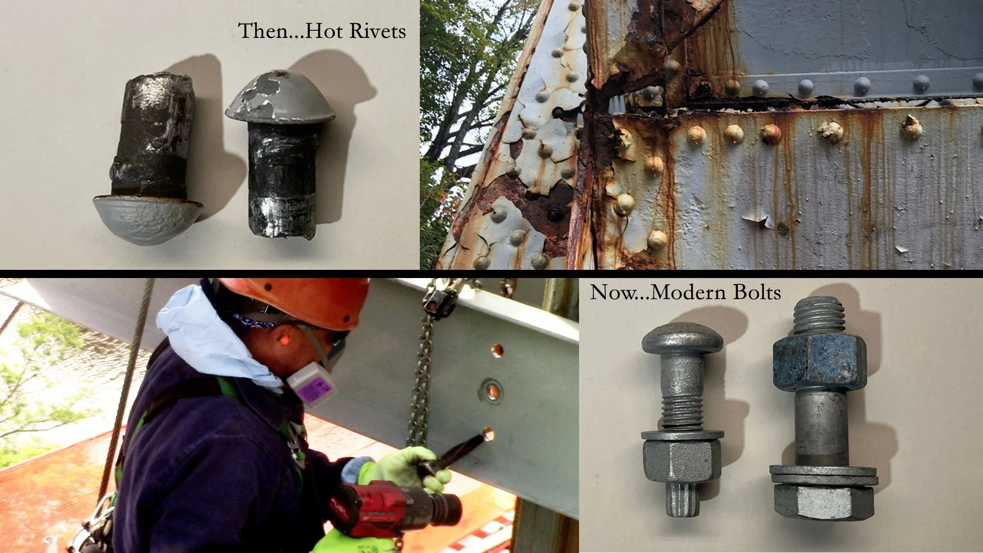 Hot rivets from the original bridge construction contrast with modern bolts designed to take the bridge into the next century. Contributed by Wurts Bridge Constructors, LLC along with laminated photos of the bridge under renovation, as well as badges and stickers.
